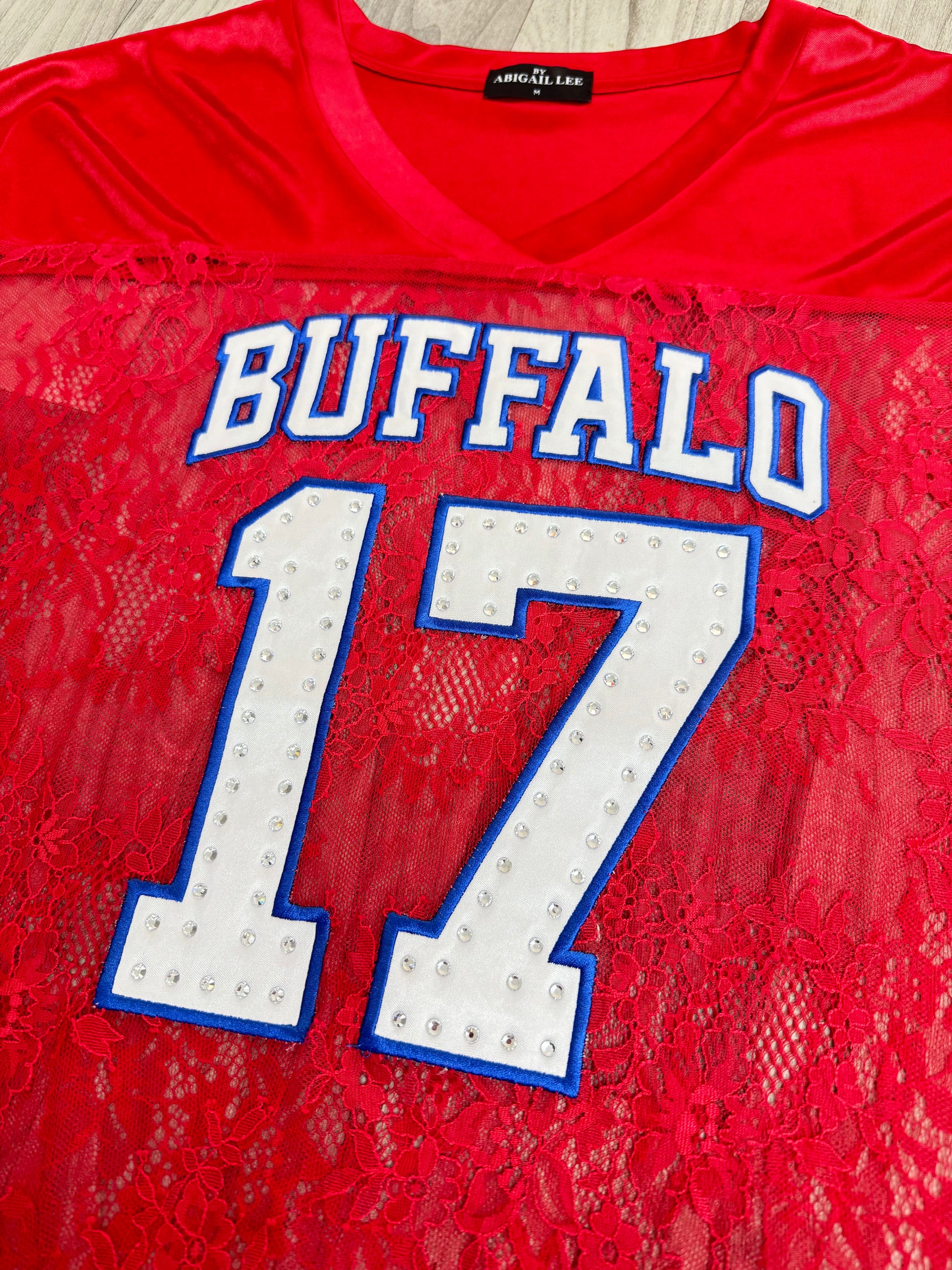 This lace me up jersey is beautiful. It arrived quick and the jersey is perfect . This jersey is so different and unique and the colors are bright and vibrant. A must have for the Bills season
